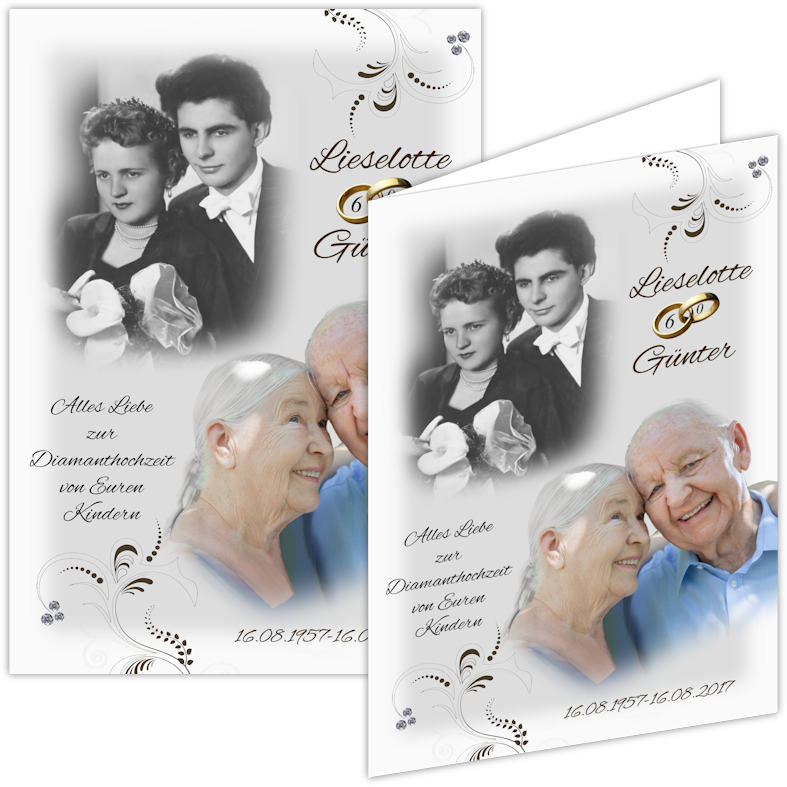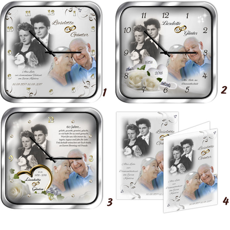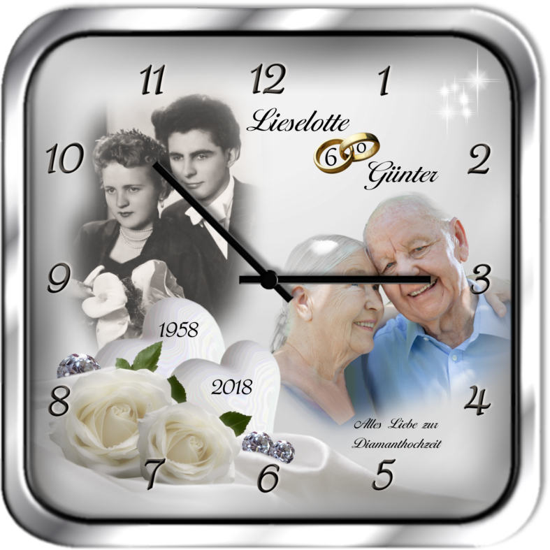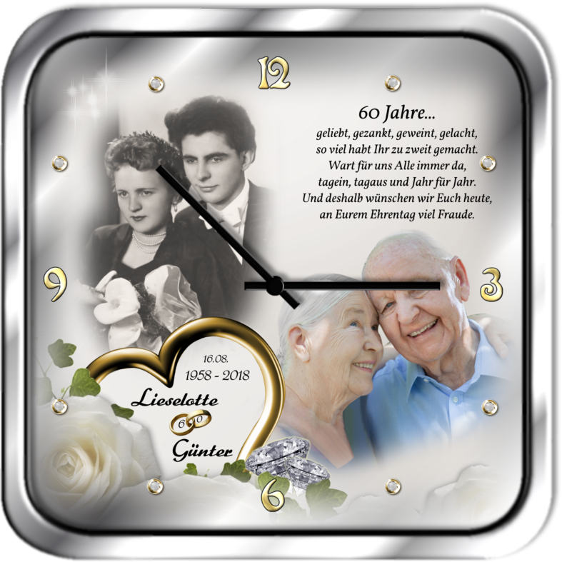 Mit diesem Geschenk ist Ihnen die Begeisterung des Jubelpaares gewiss! Die eckige Metalluhr gestalten wir mit Ihren eigenen Fotos, passend zur Diamanthochzeit, beschriften sie mit den Vornamen der Jubilare, dem Hochzeitsdatum und auf Wunsch einem passenden Spruch oder Glückwunsch. Ihre Fotos werden dabei von uns bearbeitet, optimiert und zu einer thematisch passenden Bildkomposition zusammengestellt. Im Preis inbegriffen ist die Erstellung von drei Gestaltungsvorschlägen, die wir Ihnen per E-Mail oder WhatsApp zur Auswahl zusenden.