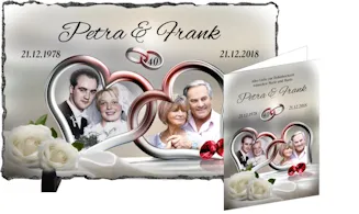 Der Fotodruck des Motives zur Rubinhochzeit mit Ihrem persönlichen Text erfolgt auf echtem ca. 0,8cm dickem Schiefer. Die rechteckige Platte aus Schieferstein gibt es als Bild oder Fotouhr zur Tisch- oder Wand-Dekoration. Das Tischmodell wird mit zwei Standfüßen geliefert. Als Wanddekoration ist die Platte/Uhr bereits mit einer Aufhängevorrichtung versehen. Dieses Modell ist wahlweise mit einem geräuscharmen Quartzuhrwerk oder einem bequemen Funkuhrwerk erhältlich.Die perfekte Geschenkidee zum 40. Hochzeitsjubiläum, denn die Uhr bedrucken wir mit einem Rubinhochzeitsmotiv und den Namen der Eheleute, dem Hochzeitsdatum und dem Datum der Rubinhochzeit sowie einem Spruch zum 40. Hochzeitstag.